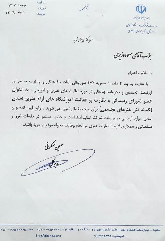 انتصاب شايستهي شما توسط مديركل فرهنگ و ارشاد اسلامي استان خراسان رضوي به عنوان عضو شوراي رسيدگي و نظارت بر فعاليت آموزشگاههاي آزاد هنري استان (كميته فني هنرهاي تجسمي)، نشاندهندهي توان و تخصص علمي و اجرايي شما در حوزه هنر و آموزش است. بدين وسيله، اين انتصاب را تبريك گفته و موفقيتهاي روزافزون شما را آرزومنديم.