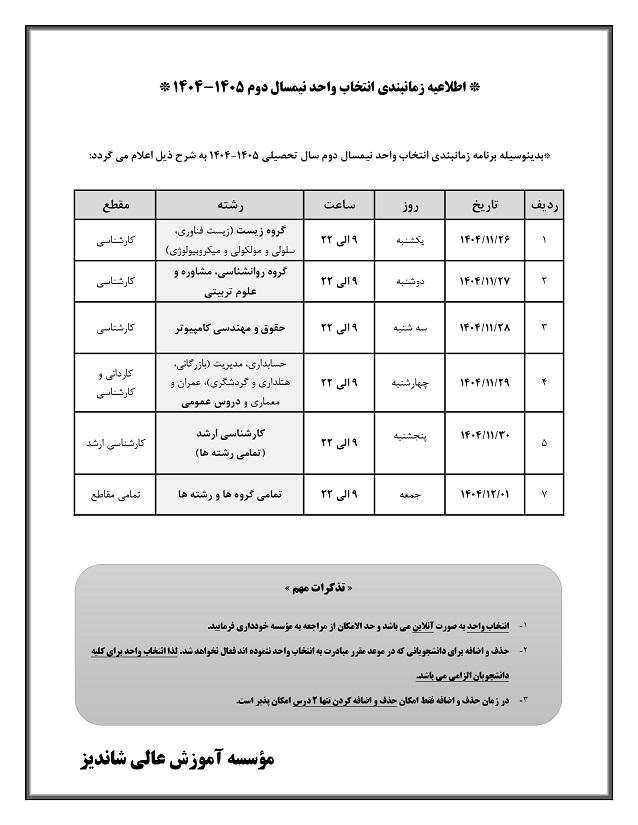 اطلاعيه زمانبندي انتخاب واحد نيمسال دوم 1405-1404