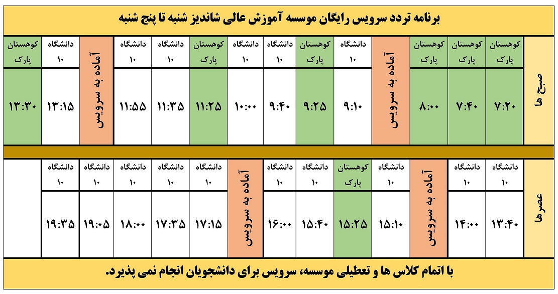 به اطلاع دانشجويان گرامي ميرساند سرويس رايگان رفت و برگشت از مبداء انتهاي بلوار وكيل آباد به محل موسسه در حال خدمترساني ميباشد.