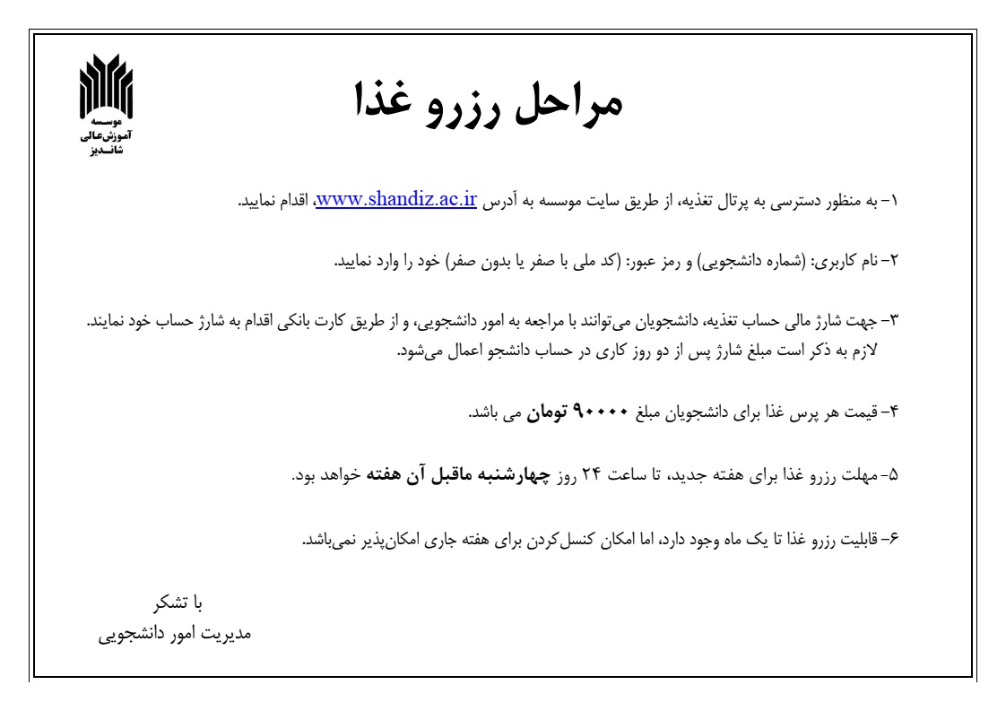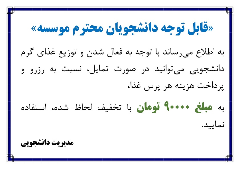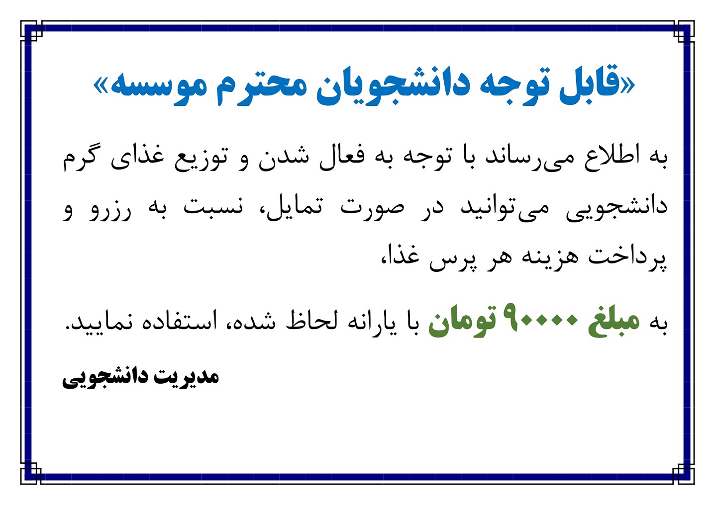 اطلاعيه آغاز مجدد سرويسدهي و فعالشدن رزرو و توزيع غذا دانشجويي