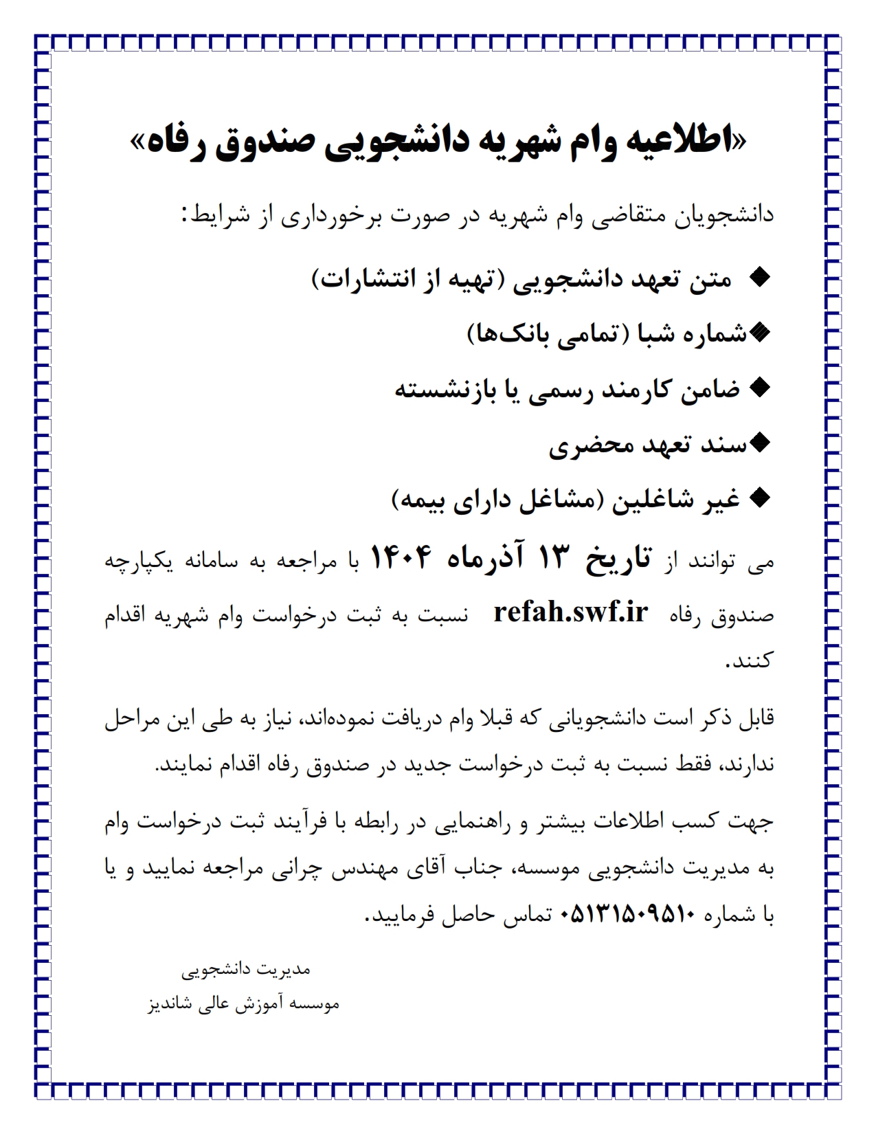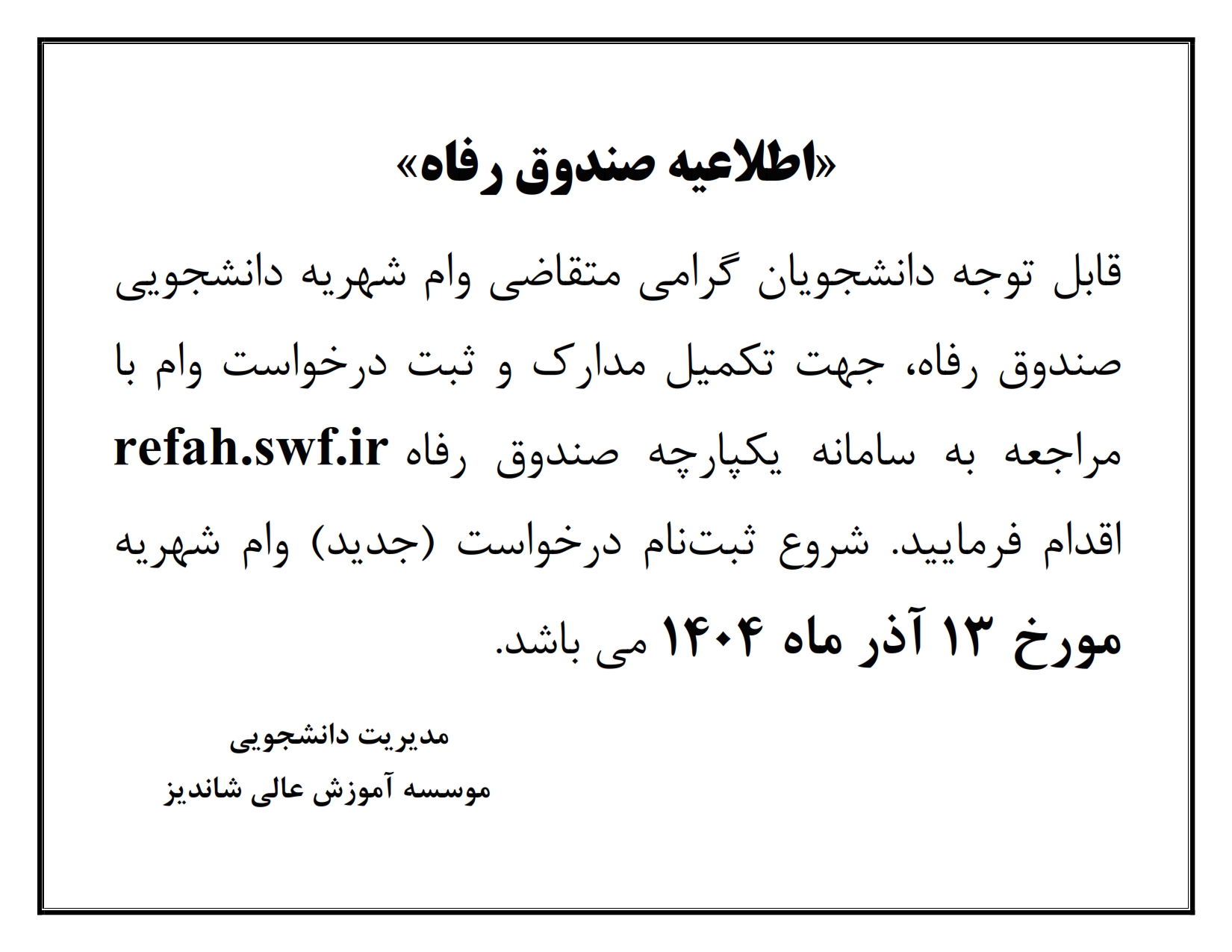 اطلاعيه صندوق رفاه دانشجويي