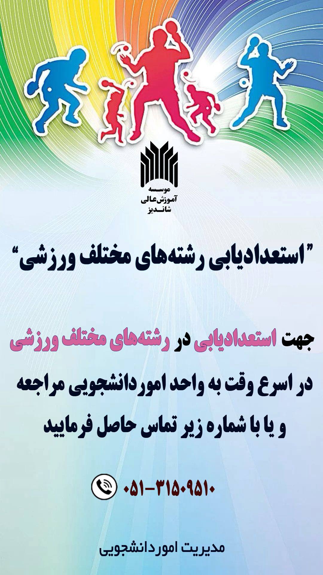 جهت استعداديابي در رشتههاي مختلف ورزشي تا چهارشنبه ۲۸ آذر به امور دانشجويي آقاي چراني مراجعه و يا با شماره زير تماس حاصل فرماييد: