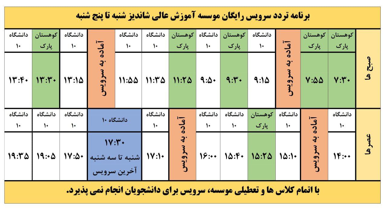 به اطلاع دانشجويان گرامي ميرساند سرويس رايگان رفت و برگشت از مبداء انتهاي بلوار وكيل آباد به محل موسسه در حال خدمترساني ميباشد.