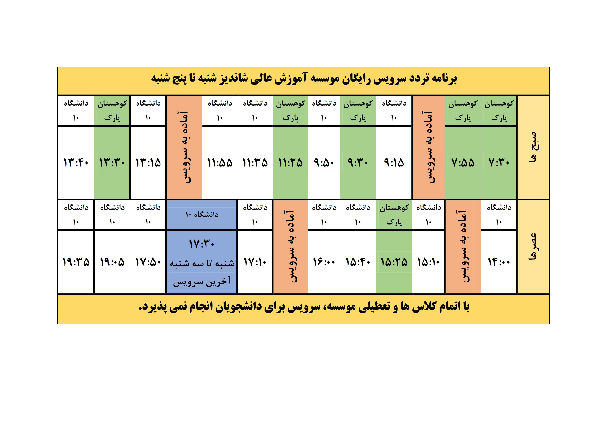 به اطلاع دانشجويان گرامي مقطع كارشناسي ارشد ميرساند سرويس رايگان رفت و برگشت از مبداء انتهاي بلوار وكيل آباد به محل موسسه در حال خدمترساني ميباشد.